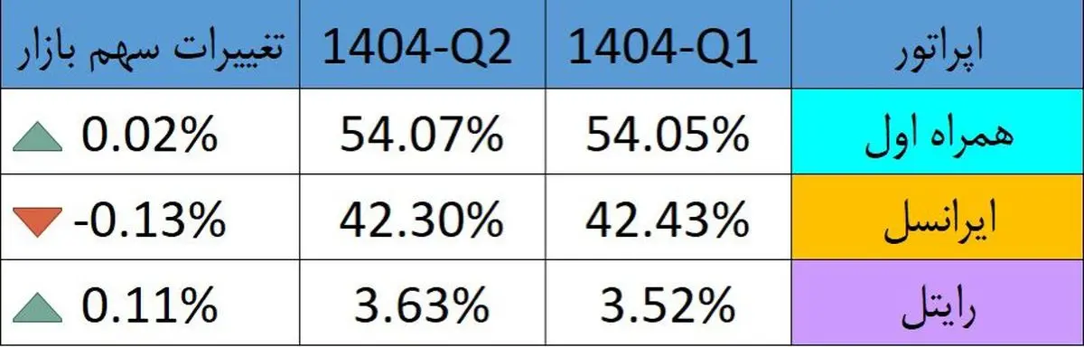 در همین حال، رایتل با افزایش ۰.۱۱ درصدی سهم بازار، حضور خود را در سطح ۳.۶۳ درصد حفظ کرده و همچنان با فاصله‌ای قابل‌توجه از دو رقیب اصلی در جایگاه سوم قرار دارد.