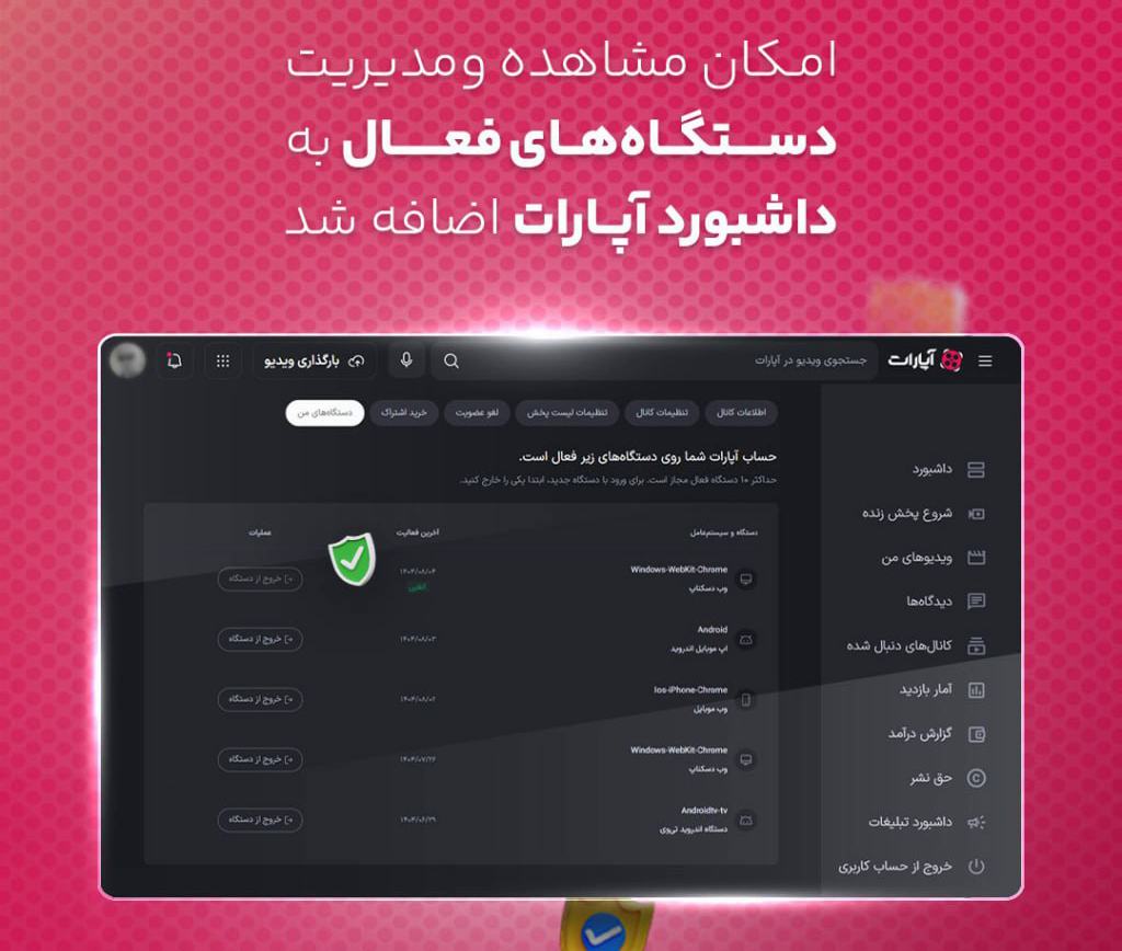 در ادامه مسیر به‌روزرسانی‌های پیاپی آپارات، قابلیت مشاهده و مدیریت دستگاه‌های فعال به داشبورد کاربران این پلتفرم اضافه شد. با این ویژگی، کاربران می‌توانند تمام دستگاه‌های متصل به حساب خود را مشاهده کرده و در صورت نیاز، تنها با یک کلیک از هر دستگاه دلخواه خارج شوند؛ قابلیتی که گامی جدی در افزایش امنیت حساب‌های کاربری به شمار می‌رود.