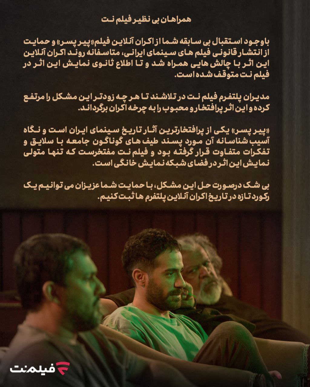 باوجود استقبال بیسابقه شما از اکران آنلاین فیلم «پیر پسر» و حمایت از انتشار قانونی فیلمهای سینمای ایرانی، متاسفانه روند اکران آنلاین این اثر با چالشهایی همراه شد و تا اطلاع ثانوی نمایش این اثر در فیلمنت متوقف شده است.