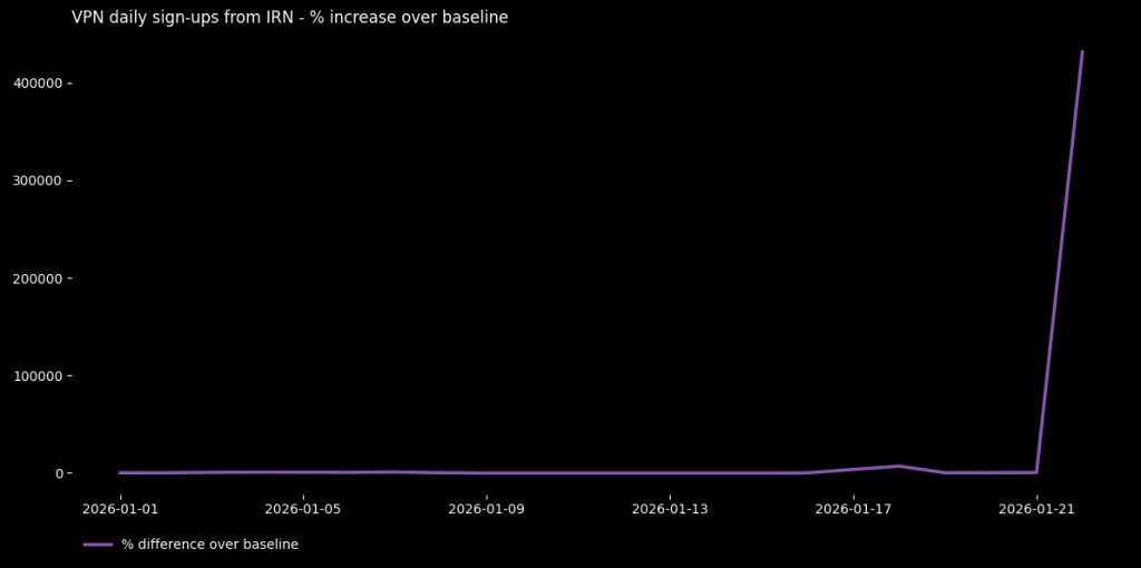 Proton VPN نیز داده‌های خودش مربوط به ثبت‌نام در این VPN را منتشر کرده است. طبق اعلام این سرویس، دقیقاً ۱۰ روز پس از شروع خاموشی کامل ارتباطات، میزان ثبت‌نام کاربران ایرانی، افزایشی ۴۰۰ هزار درصدی داشته است.