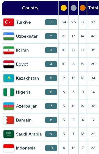 در ادامه جدول توزیع مدالهای بازیهای کشورهای اسلامی تا این لحظه را مشاهده میکنید: