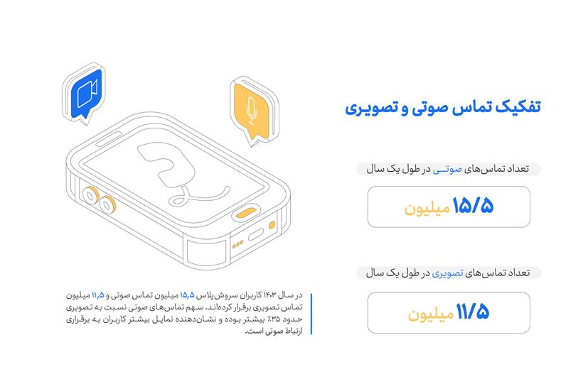 به گزارش توسعه برند، طبق دادههای گزارش سروشپلاس، ۱۵/۵ میلیون تماس صوتی کاربران این پلتفرم را در طول یک سال گذشته به یکدیگر متصل کرده است. طولانیترین تماس نیز مربوط به کاربری است که ۲۷ ساعت مداوم، بیش از یک شبانهروز، در تماس مانده و آن را قطع نکرده است.