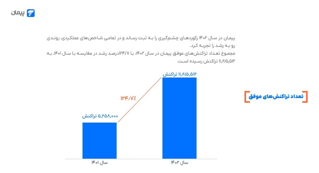 مجله تیتر ۱۲ به نقل از دیجیاتو، پیمان در گزارش سال ۱۴۰۲ خود اعلام کرده در این سال با ۱۲۴ درصد رشد، ۱۱ میلیون و ۸۱۵ هزار تراکنش موفق ثبت کرده است. تعداد کل تراکنشها نیز ۲۵ میلیون و ۹۴۱ هزار عدد بوده که ۴۱ درصد آنها به دلیل کمبود موجودی حساب بانکی کاربر، نهایی نشده و ۱۳.۴ درصد نیز به علت اختلال سیستمی ناموفق بودهاند.