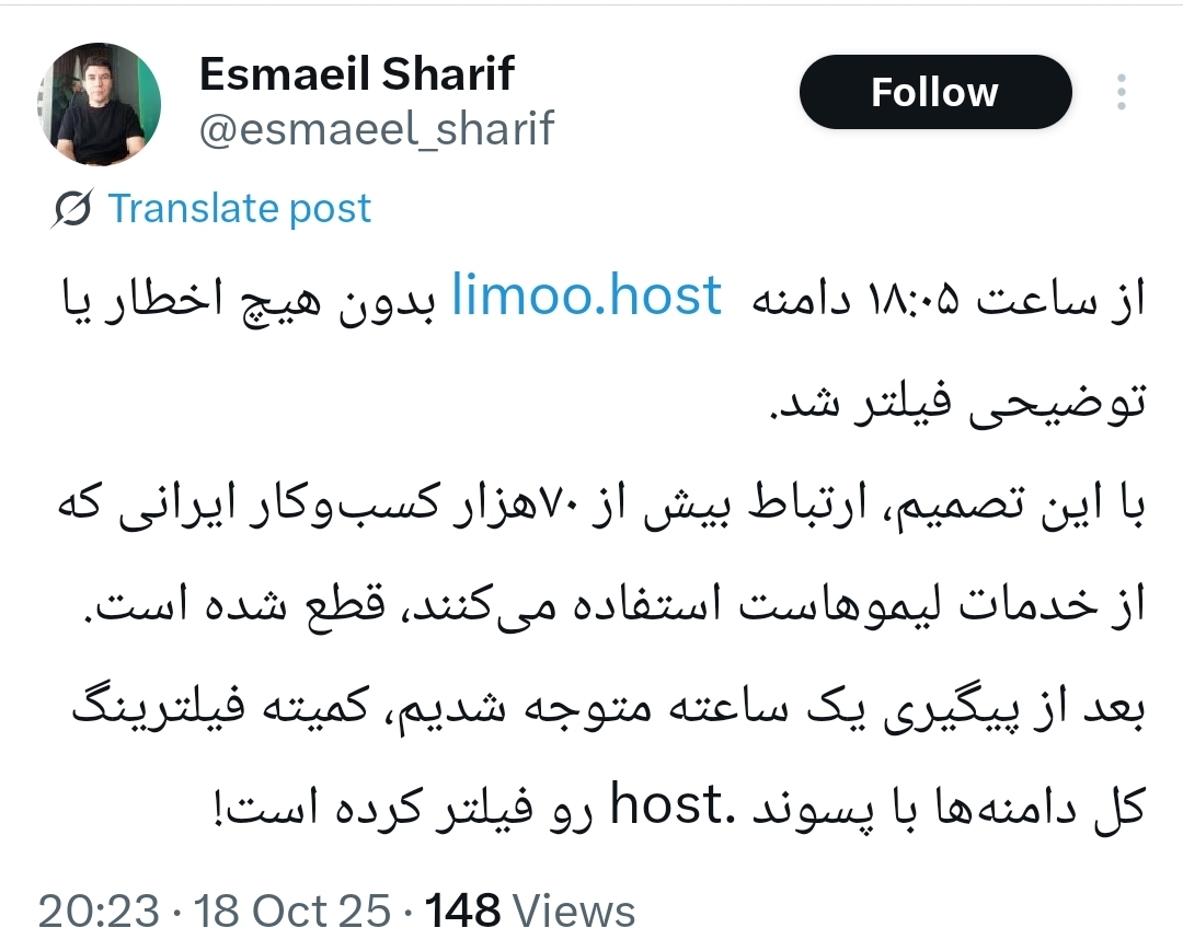 فیلتر شدن دامنه «limoo.host» بدون اخطار؛ قطع دسترسی بیش از ۷۰ هزار کسبوکار ایرانی