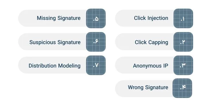 پلتفرم ادتریس با استفاده از الگوریتمهای پیشرفته توانسته است تقلبهای مختلفی را شناسایی کند. انواع این تقلبها به شرح تصویر است: