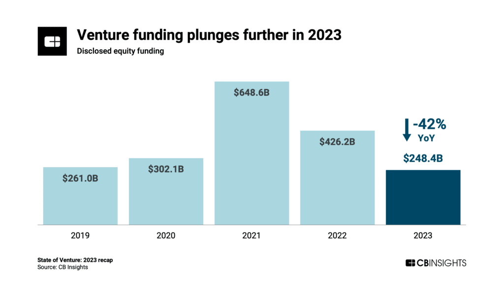 سال ۲۰۲۳، ورق برگشت و همزمان با کاهش ۳۰ درصدی حجم معاملات جهانی، میزان سرمایهگذاری خطرپذیر نیز با کاهش ۴۲ درصدی به ۲۴۸.۴ میلیارد دلار رسید که کمترین میزان از سال ۲۰۱۷ بوده است. رکود جهانی اقتصاد باعث شده سرمایهگذاران در انتخابهایشان محتاطتر شوند؛ بهویژه از سرمایهگذاری در راندهای بزرگتر اجتناب کنند.