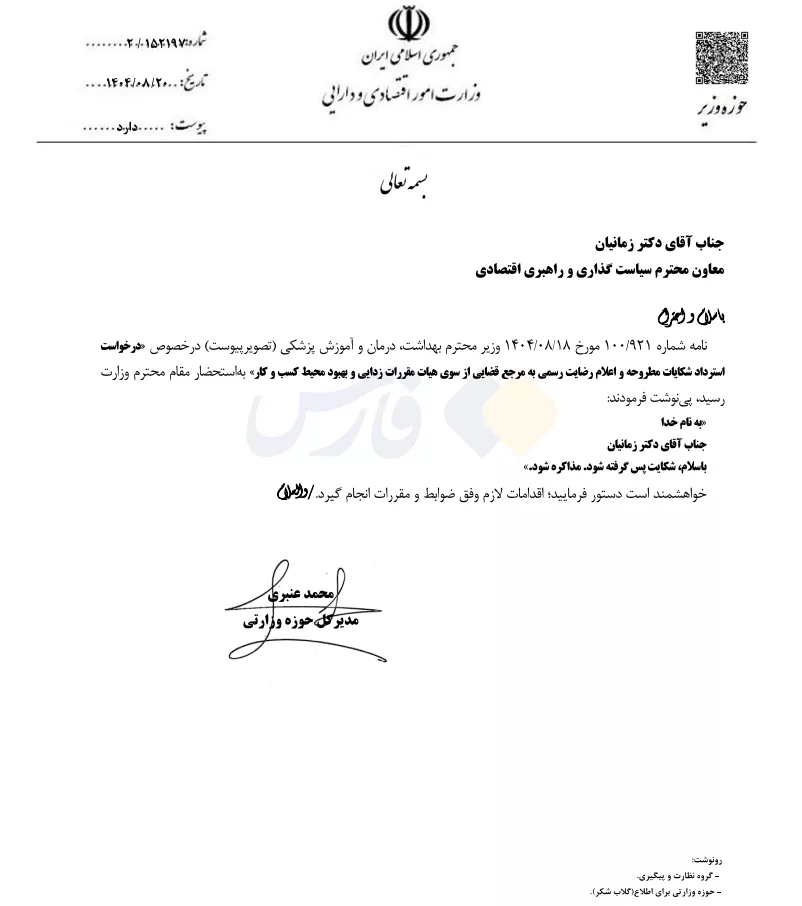 اکنون خبرگزاری «فارس» اسنادی را منتشر کرده که نشان میدهد وزیر اقتصاد دستور به استرداد شکایت و اعلام رضایت رسمی به مرجع قضایی از سوی هیئت مقرراتزدایی داده است.