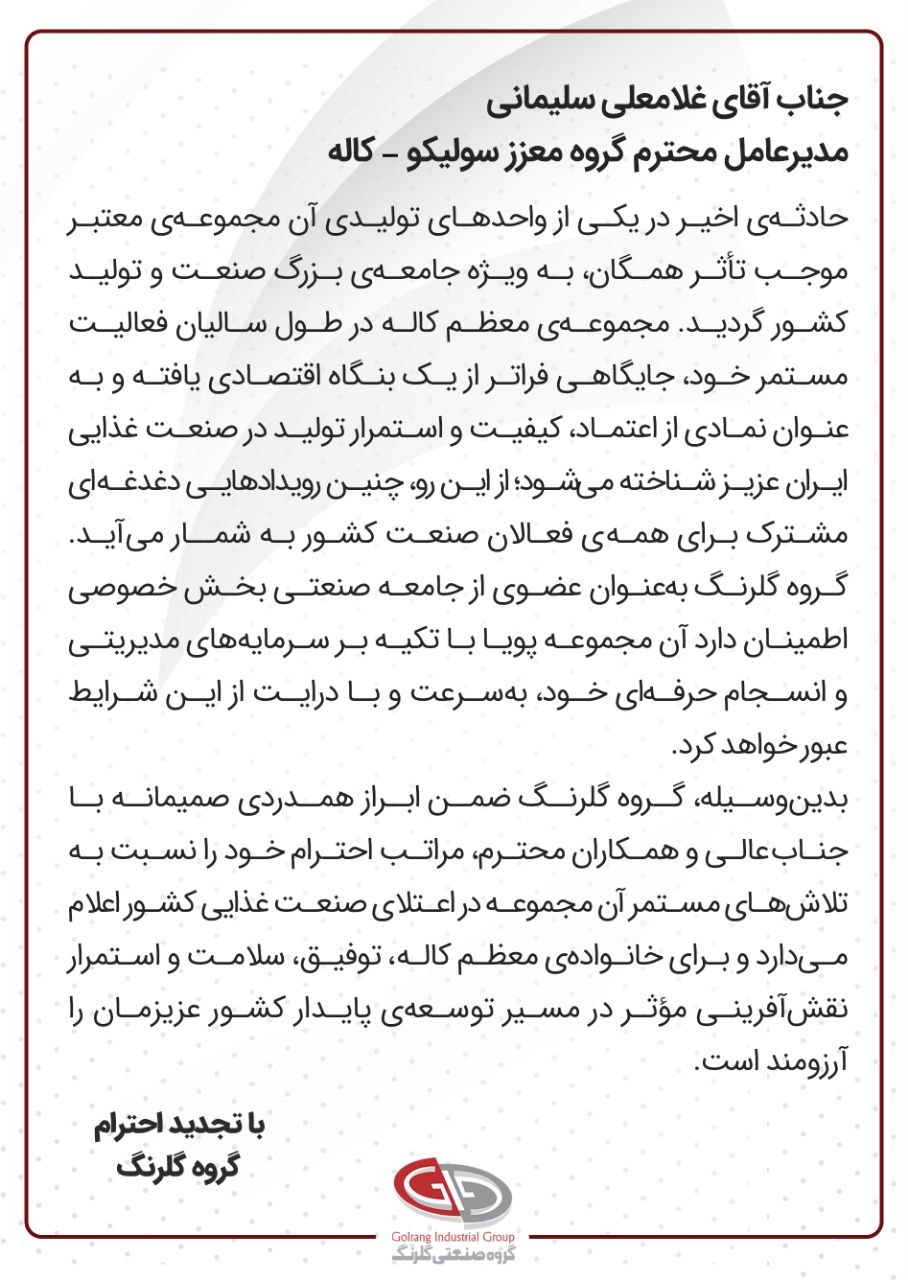 در پی وقوع حادثه آتشسوزی در یکی از واحدهای تولیدی مجموعه کاله، گروه صنعتی گلرنگ با انتشار پیامی خطاب به آقای غلامعلی سلیمانی، مدیرعامل گروه سولیکو-کاله، ضمن ابراز تأسف و همدردی، بر جایگاه ارزنده برند کاله در صنعت غذایی کشور تأکید کرد.