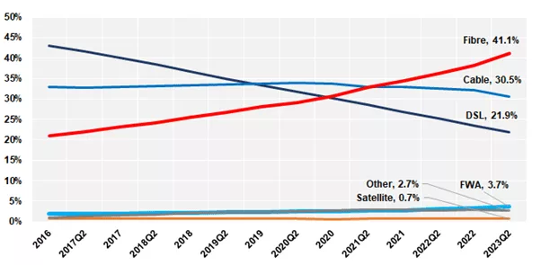 فقط در فاصله سالهای ۲۰۲۰ تا ۲۰۲۳ مشترکین فیبر نوری در این کشورها ۵۶ درصد رشد کرده است. میتوان بهوضوح دید امتیازهای فیبر در میان این کشورها درک شده است.
