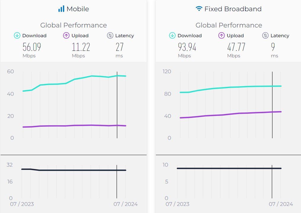 در گزارش اسپیدتست برای ژوئیه ۲۰۲۴، میانگین سرعت اینترنت موبایل در جهان کاهش یافته، درحالیکه میانگین سرعت اینترنت ثابت افزایش یافته است. البته باید به این موضوع اشاره کرد که این تفاوت بسیار اندک است. میانگین سرعت اینترنت موبایل و ثابت جهان در ماه مه بهترتیب برابر ۵۶.۰۹ و ۹۳.۹۴ مگابیت بر ثانیه گزارش شده است.