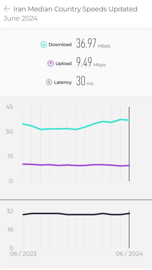 ایران در این ردهبندی با سرعت ۳۶.۹۷ مگابیت بر ثانیه برای اینترنت موبایل در جایگاه ۶۵ و با سرعت ۱۴.۷۷ مگابیت بر ثانیه برای اینترنت ثابت در ردهبندی ۱۴۴ قرار گرفته است. این آمار نشاندهنده کاهش جزئی سرعت در مقایسه با ماه گذشته است. با این حال، ایران در هر دو بخش اینترنت موبایل و ثابت، رتبه خود را در ردهبندی جهانی ارتقا داده است.