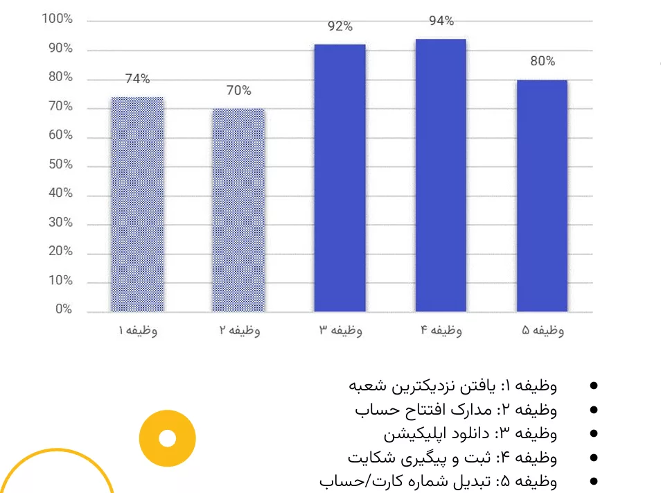 باوجوداین نتایج تحقیق نشان میدهد کاربران در استفاده از ۲ خدمت اصلی، یافتن شعبه و دریافت اطلاعات افتتاح حساب، به مشکل خوردهاند. حدود ۳۰ درصد کاربران نتوانستند این ۲ وظیفه را کامل انجام بدهند. درحالیکه این ۲ خدمت از پرکاربردترین خدمات در وبسایتهای بانکی هستند.