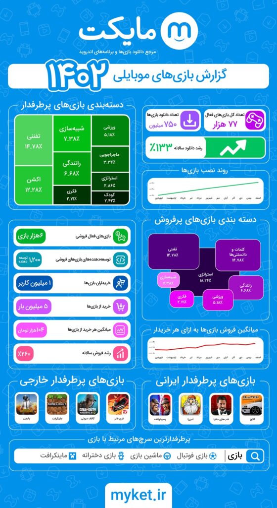 گزارش مایکت نشان میدهد صنعت بازیهای موبایلی در ایران طی سالهای اخیر رشدی چشمگیر کرده است؛ دانلود بازیهای موبایلی در سال گذشته ۱۳۳ درصد نسبت به سال قبل افزایش یافته است. علاوهبر افزایش دانلود، تمایل کاربران به خرید بازیهای موبایلی نیز افزایش قابلتوجهی داشته است؛ بهطوریکه فروش بازیها در مایکت ۲۶۰ درصد رشد کرده است.