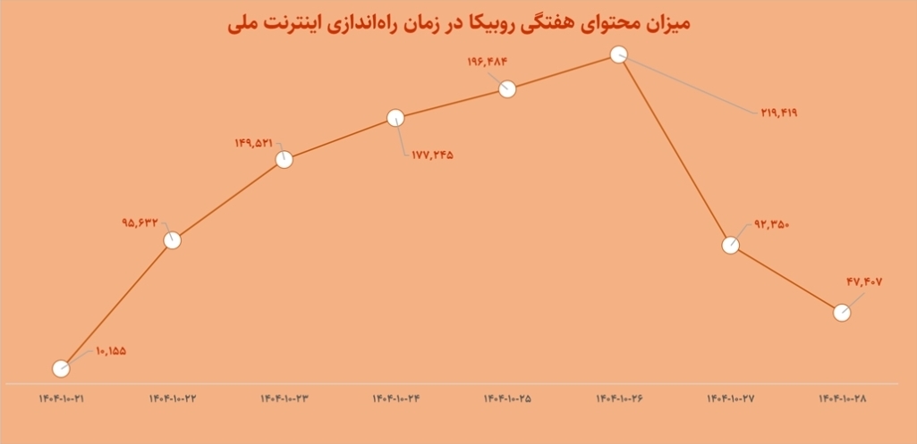 نمودار تولید محتوا در روبیکا نشاندهنده یک افزایش سریع و چشمگیر در روزهای فعالسازی اینترنت ملی (از ۲۱ تا ۲۸ دی) است که از حدود ۱۰ هزار به نزدیک ۲۲۰ هزار محتوا رسید، اما این رشد با بازگشت تدریجی دسترسی به اینترنت جهانی و سرویسهای ارتباطی دیگر مانند پیامرسانهای رقیب، به سرعت و به میزان حدود ۷۸٪ کاهش یافت و نشان داد که اقبال به روبیکا بیشتر یک راهحل موقتی در شرایط فقدان دسترسی به پلتفرمهای معمول بوده است.