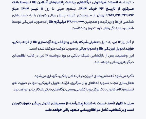 «میلی» در اطلاعیهای اعلام کرد که به دلیل «انسداد غیر قانونی» درگاههای پرداخت موقتاً تسویه ریالی و تحویل فیزیکی طلا…