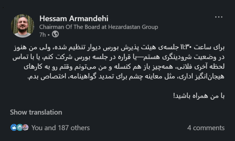 «حسام آرمندهی»، رئیس هیئتمدیره گروه هزاردستان، خبر برگزاری جلسه هیئتپذیرش بورس برای بررسی امکان پذیرش سهام دیوار در بازار سرمایه…